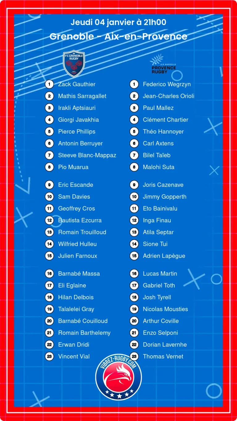 Grenoble – Aix-en-Provence: Les compositions : Ci-dessus la composition des deux équipes qui s’affronteront ce week-end, dont le match sera à suivre en direct à la RADIO et/ou en scores-live sur notre site ou notre application , dans le menu 🔴 EN DIRECT ci-dessous pour suivre votre match la Radio et/ou score live. Suivez en live chaque week-end toutes les compétitions des équipes du XV DE FRANCE, Coupe d’Europe, Top 14, Pro d2, Nationale et Fédérale 1,2 et 3.
