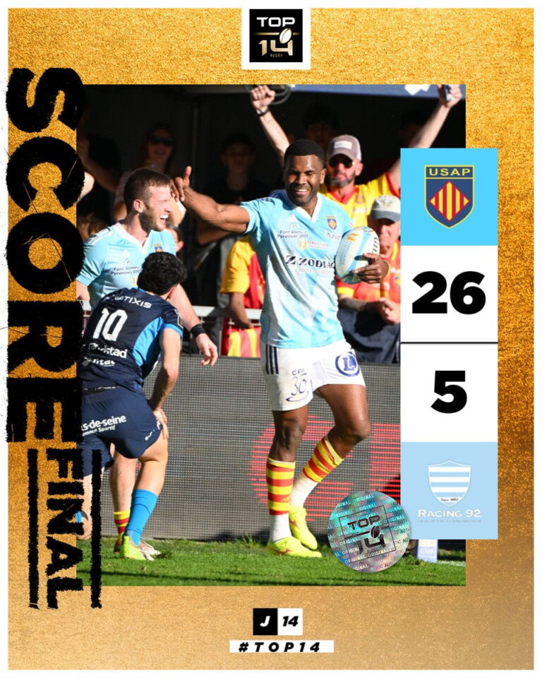 Perpignan s’est imposé à domicile avec le bonus offensif face au Racing 92 (26-5), qui pourrait perdre sa place de leader en fonction des résultats des autres matches de cette 14e journée.