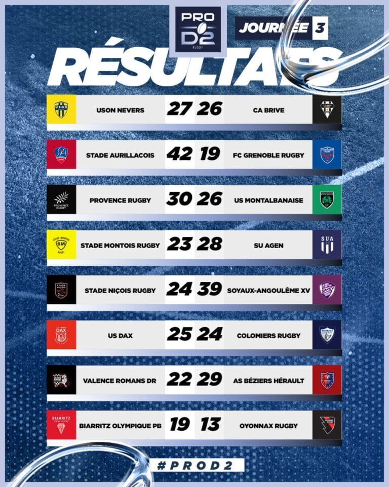 Pour résumer : Dax et Biarritz poursuivent leur parcours sans faute en Pro D2 avec une troisième victoire consécutive. Dax l’a emporté de justesse contre Colomiers (25-24), tandis que Biarritz a pris le dessus sur Oyonnax (19-13). Soyaux-Angoulême reste en embuscade à deux points, alors qu’Aurillac a surpris Grenoble avec une victoire éclatante (42-19).