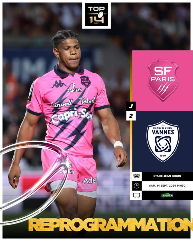 La rencontre entre le Stade Français et le RC Vannes, comptant pour la deuxième journée de Top 14, se jouera plus tôt que prévu. Initialement programmé à 16h30, le coup d’envoi du match a été avancé à 14h30 ce samedi au Stade Jean-Bouin. Cette décision a été prise à la demande de la préfecture de Paris, en accord avec les deux clubs et le diffuseur, pour éviter la coïncidence avec le défilé des athlètes olympiques et paralympiques français qui se tiendra le même jour sur les Champs-Élysées.