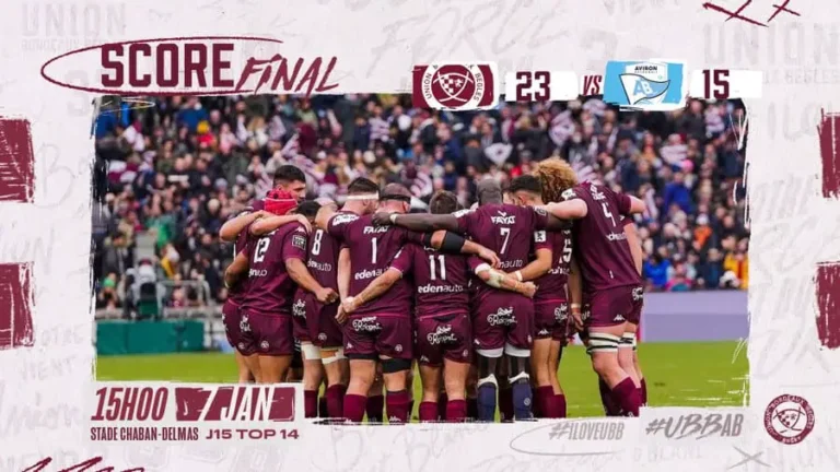 Bordeaux, 7 jan 2023 (AFP) – Bordeaux-Bègles, en enchaînant un quatrième succès de rang en Top 14 aux dépens de Bayonne (23-15) qui s’est réveillé trop tardivement, a confirmé son renouveau samedi en ouverture de la 15e journée.