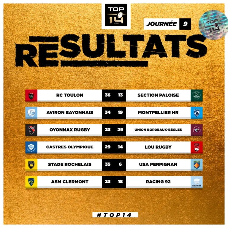 Le Racing 92 est tombé samedi à Clermont avec une équipe remaniée, mais est assuré de conserver les commandes du Top 14 à l’issue de la 9e journée, qui a vu La Rochelle se rassurer (un peu) contre Perpignan avant de remettre son titre en jeu en Champions Cup.