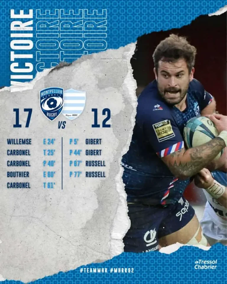 Les Montpelliérains ont fait preuve de plus de réalisme et de justesse pour marquer au coeur de chaque période, deux essais par ses internationaux Paul Willemse (25e) et Anthony Bouthier (60e).