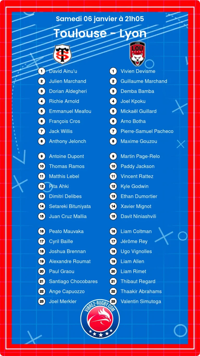Toulouse – Lyon: Les compositions : Ci-dessus la composition des deux équipes qui s’affronteront ce week-end, dont le match sera à suivre en direct à la RADIO et/ou en scores-live sur notre site ou notre application , dans le menu 🔴 EN DIRECT ci-dessous pour suivre votre match la Radio et/ou score live. Suivez en live chaque week-end toutes les compétitions des équipes du XV DE FRANCE, Coupe d’Europe, Top 14, Pro d2, Nationale et Fédérale 1,2 et 3.